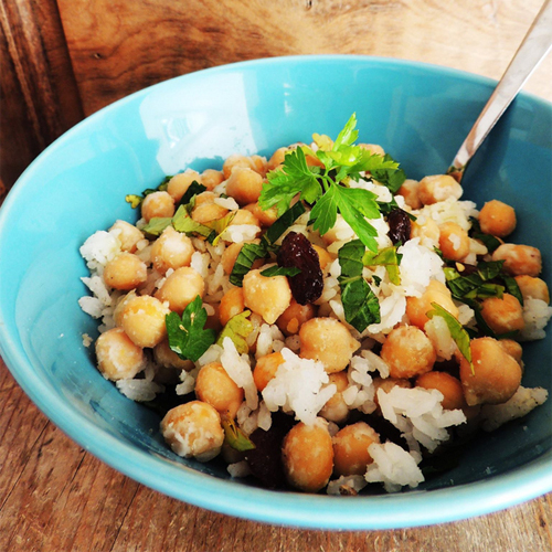 Then add the cold rice to the chickpeas, followed by the raisins and herbs.